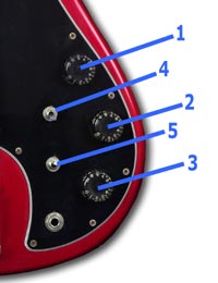 [1] Master volume control [2] Bass control 0 to 10 [3] Treble control 0 to 10 [4] Pickup selector switch [5] Series/parallel switch up - coils in series, down - coils in parallel