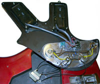 The pickguard is five-ply black-white-black-white-black, and held in place with 12 cross-head pickguard screws. The dual-pickup Custom was a purely passive bass, unlike the Victory Artist, and therefore had differing controls, but the pickup and control placings were identical; both models used the same scratchplate. Compare this image with an equivalent for the Victory Artist.