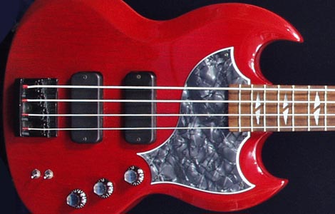 The Gibson SG-Z bass is one of the least known 'new' Gibson basses. When launched it was the first new bass model for over a decade. It was only available for a brief time between 1998-2002, though it does not seem to have sold well, and was most likely produced only in small numbers. It was built at Gibson's Nashville plant alongside it's sibling the SGZ six-string guitar. Both have the same 'Z' (assuming that is what it is) split diamond headstock inlays; the guitar version is actually strung through the body, and has a similar Z-style tailplate. The original specification was for an all-mahogany long scale bass with a 21 fret wenge fingerboard. By the 2001 catalogue, the specification had changed to rosewood. It was originally named the EB-Z as this Gibson Press Release from August 1998 confirms. Listed finishes were Heritage Cherry, Ebony and, Natural Oil.