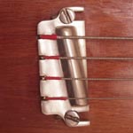 Gibson two-point Tune-O-Matic bridge. Introduced in around 1967, the two point bridge was Gibsons first attempt at a bass bridge that allowed separate intonation of each string. The bridge attaches to its posts by means of two hex screws. When posts or hex screws are worn, the bridge can tip forward to some extent (some people call this bridge the Gibson ever-tilt), which can cause problems with action, and intonation. This is common in basses with no under-bridge mute. Notice also that the silk wraps at the ball end of the string don't always stop before the bridge saddle, avoided, by removing some of the wraps with a razor blade, or better still buying strings with no wraps. Most versions had the nylon saddles pictured here, though around late 71, early 72 some of these bridges were equipped with chrome plated metal saddles. more