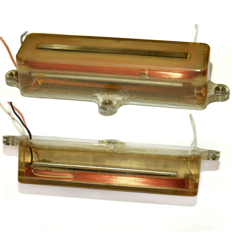 The Gibson G3 pickups, and the innovative electronics associated with them were the product of Gibson designer Bill Lawrence, for a "bright/low" tonality. The pickup itself was simple: a single coil around a Alnico magnet, both embedded in clear resin. Thanks to the translucent covers used in early examples, we can see exactly what is inside. Although the pickups were single coil, they were wired together into various humbucking configurations: the controls did not allow for any pickup to be selected alone - see the description of controls for more information on this.